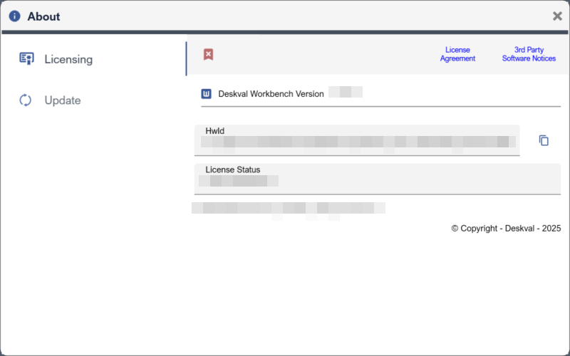 Licensing tab displays License Status, Hardware Id (HwId) and Deskval Workbench Version.