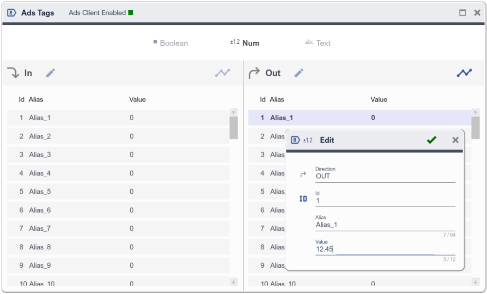 For Boolean Tags that are OUT directional, values are editable through the ON-OFF buttons. |