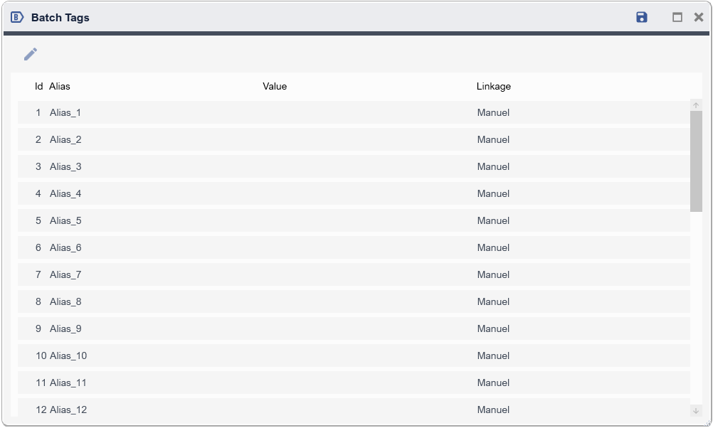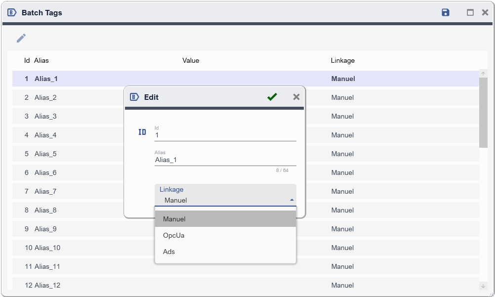 The source of a Batch Tag Value is configurable through the Edit dialog.