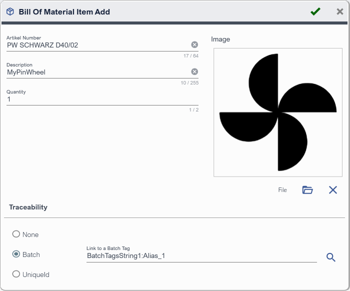 In this option, a Batch Tag is associated with Traceability Data. The source feeding the Batch Tag value can be configured from the Batch Tags window. |