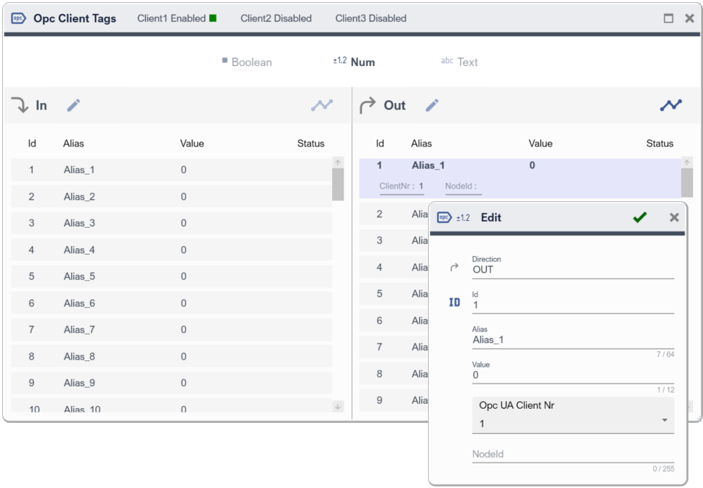 Open the Edit dialog and Configure your Opc UA Client Tag ( in this example Num1 ) |