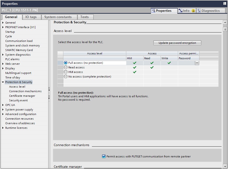 - Make sure, In the Protection&Security section, "Permit access PUTGET communications from remote partner" is checked and "Full access" is checked