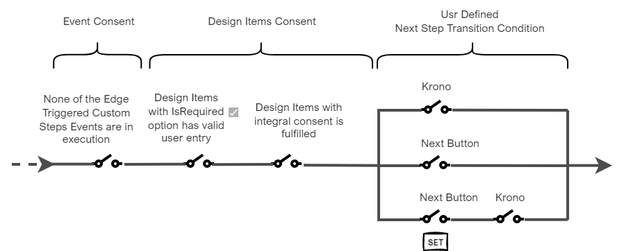 If Event and Design Item Consents are not satisfied, and/or Next Button click is not captured within Krono time, flow will not automatically move and will wait for the conditions to be satisfied. |